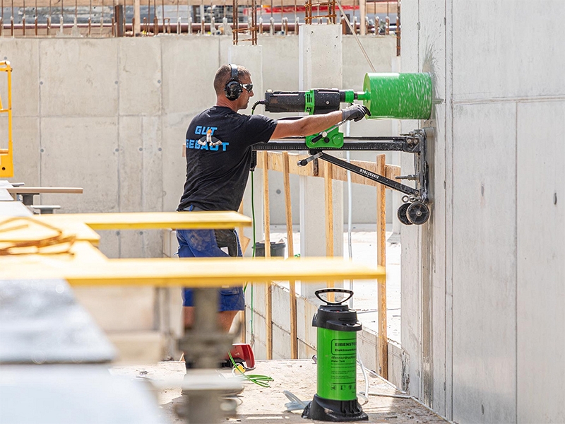 Двигатель алмазного бурения Eibenstock EBM 352/3 (Айбеншток ЕБМ 352/3) предназначен для мокрого сверления отверстий Ø 41 – 352 мм в железобетоне, кирпиче, натуральном камне и асфальте в гражданском и промышленном строительстве, при проведении электромонтажных работ, монтаже систем водоснабжения, отопления, вентиляции и других инженерных сантехнических коммуникаций, с применением станины для алмазного бурения.