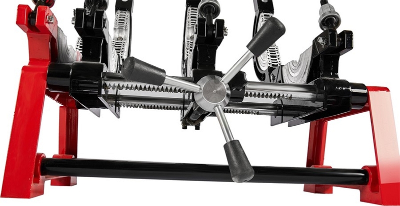 - Центратор с 4-мя откидными зажимами и фиксатором имеет большой запас прочности за счет качественного сплава и ребер жесткости, что позволяет сваривать полимерные трубы с любым показателем SDR
